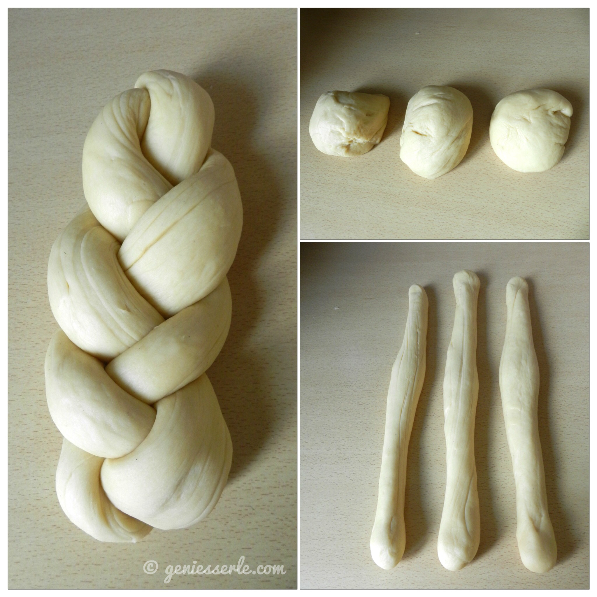 Den aufgegangenen Teig in 3 Stücke teilen – bei mir waren das je ca. 220 g – diese zu drei Strängen formen und zu einem Zopf flechten.