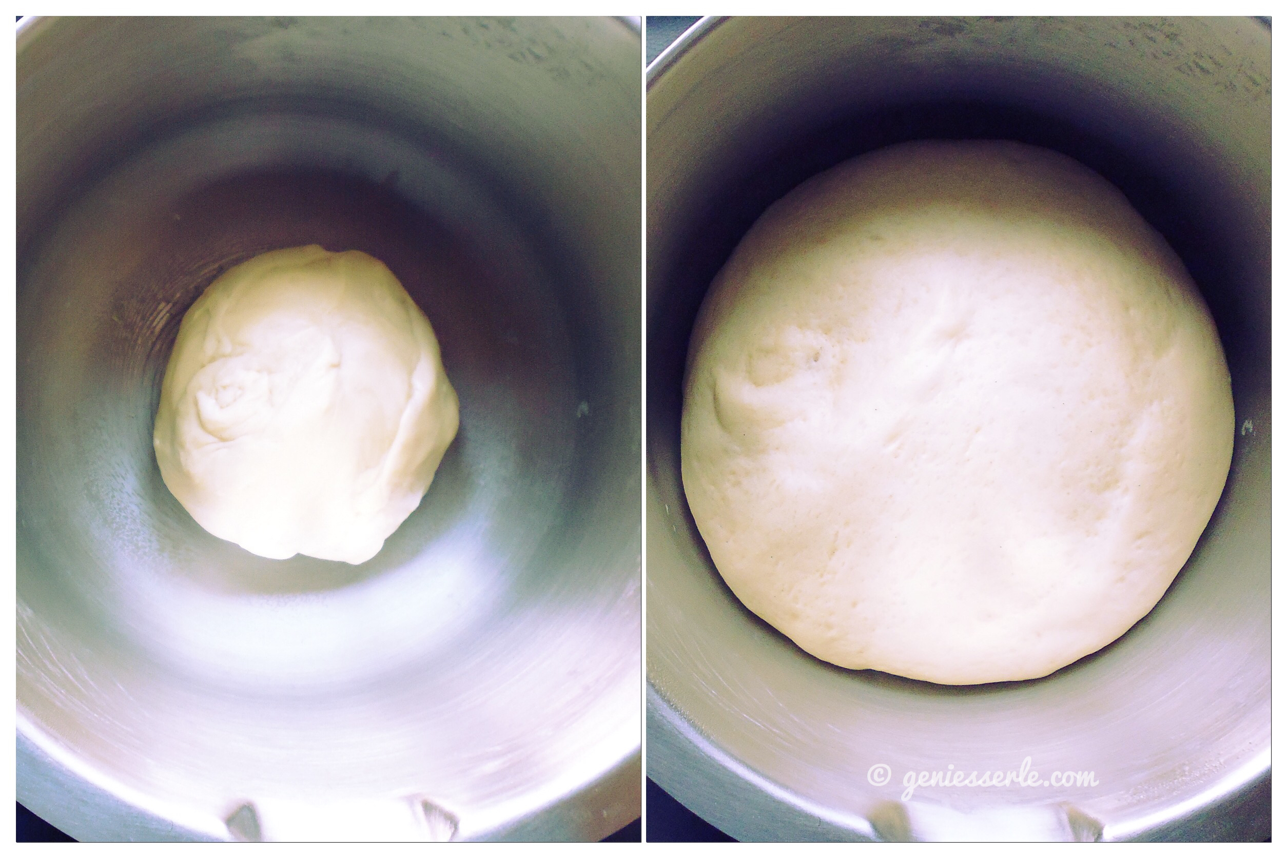 Ist der Teig zu klebrig, kann man noch etwas mehr Mehl dazugeben. Bei mir war das der Fall – nach Zugabe von einem gehäuften El Mehl (ca. 40 g) – hat es dann aber gepasst.