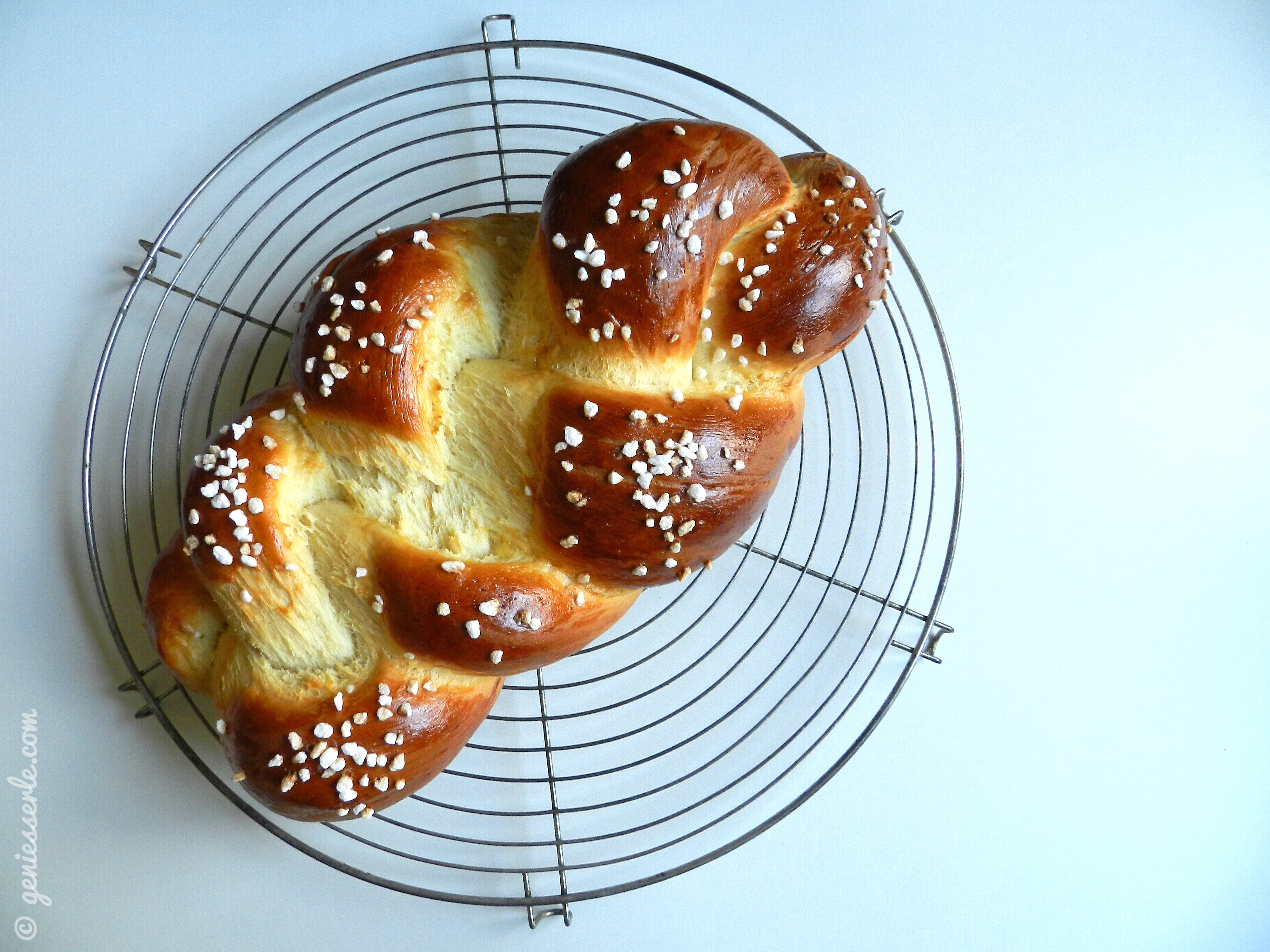 Das zweite Ei verkleppern und den aufgegangenen Zopf damit rundum bestreichen, mit Hagelzucker bestreuen.