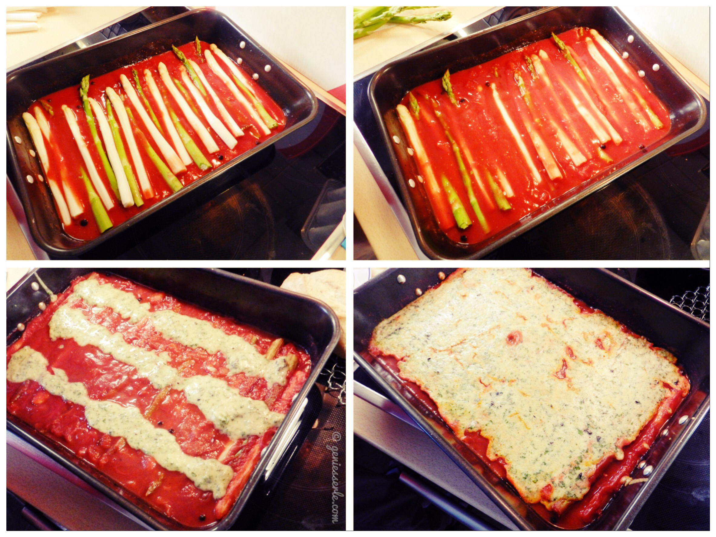 Den geschälten Spargel, nebeneinander, auf das Tomatensugo in die Auflaufform schichten – etwas herunterdrücken, damit die Spargel vom Sugo bedeckt sind.