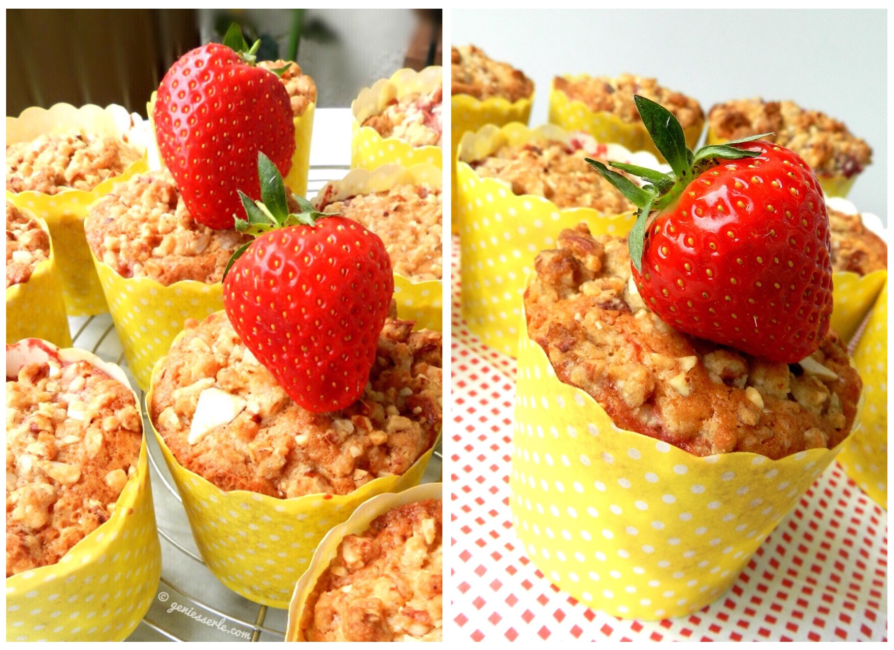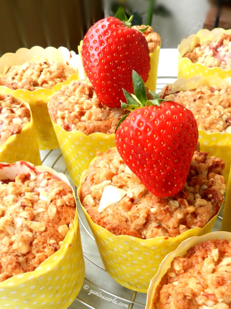 Eigentlich wollte ich vergangenes Wochenende ein Erdbeer-Tiramisu zubereiten und als Dessert zu einem gemütlichen Mädelsabend mitnehmen, aber irgendwie war es mir dann zu kompliziert das Tiramisu auf dem Fahrrad zu transportieren und so hab‘ ich mich entschieden aus den bereits gekauften und schon ziemlich reifen Erdbeeren, Muffins herzustellen … und ich sag Euch, das war keine schlechte Entscheidung 😉