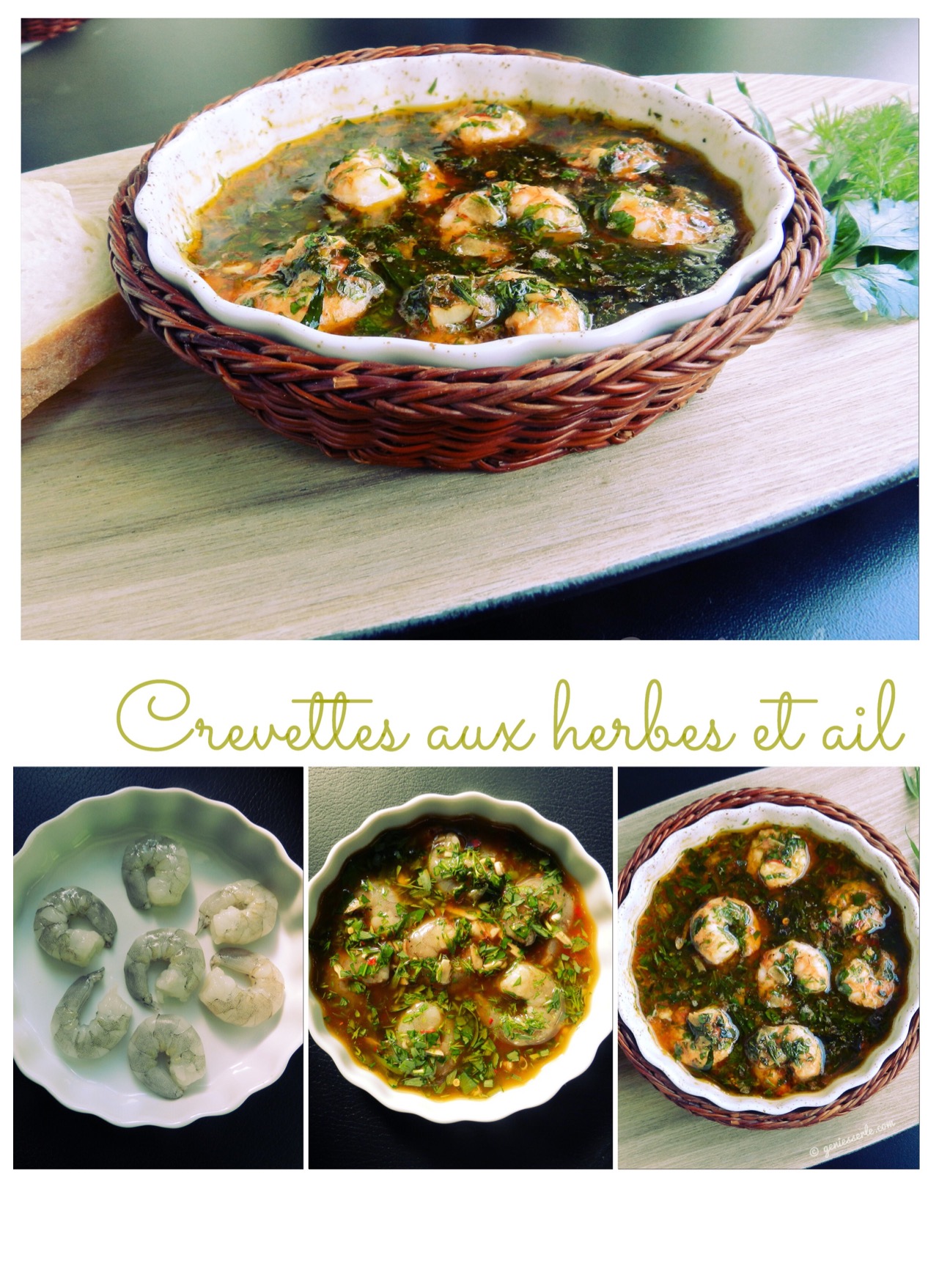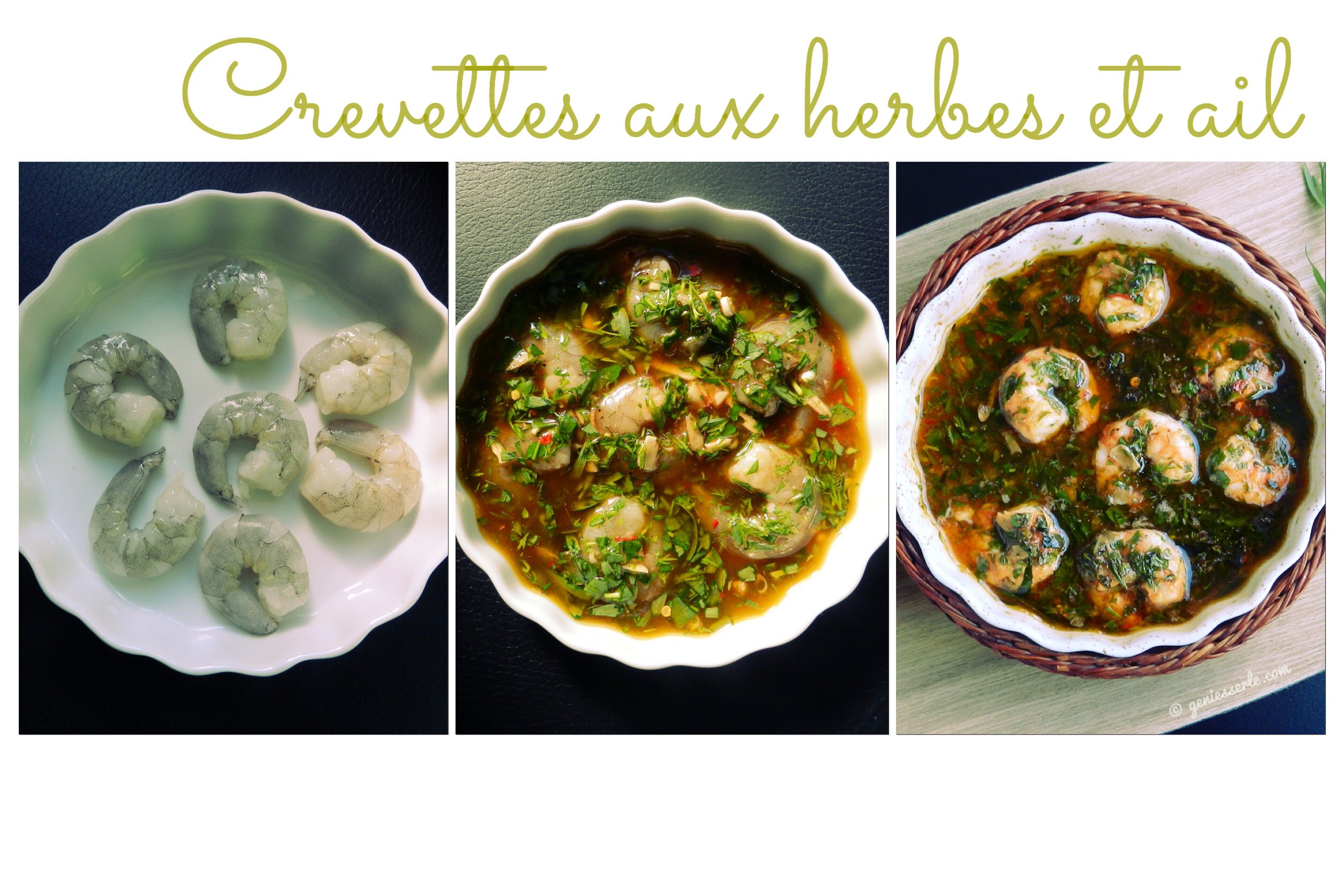 Nun werden die „Crevettes aux herbes et ail“ in die oberste Schiene des Backofens eingeschoben und dort – nur mit Oberhitze – so lange gegart, bis die Garnelen durch sind und die Öl-Kräuter-Mischung leicht blubbert. Das dauert ca. 5-10 Minuten.
