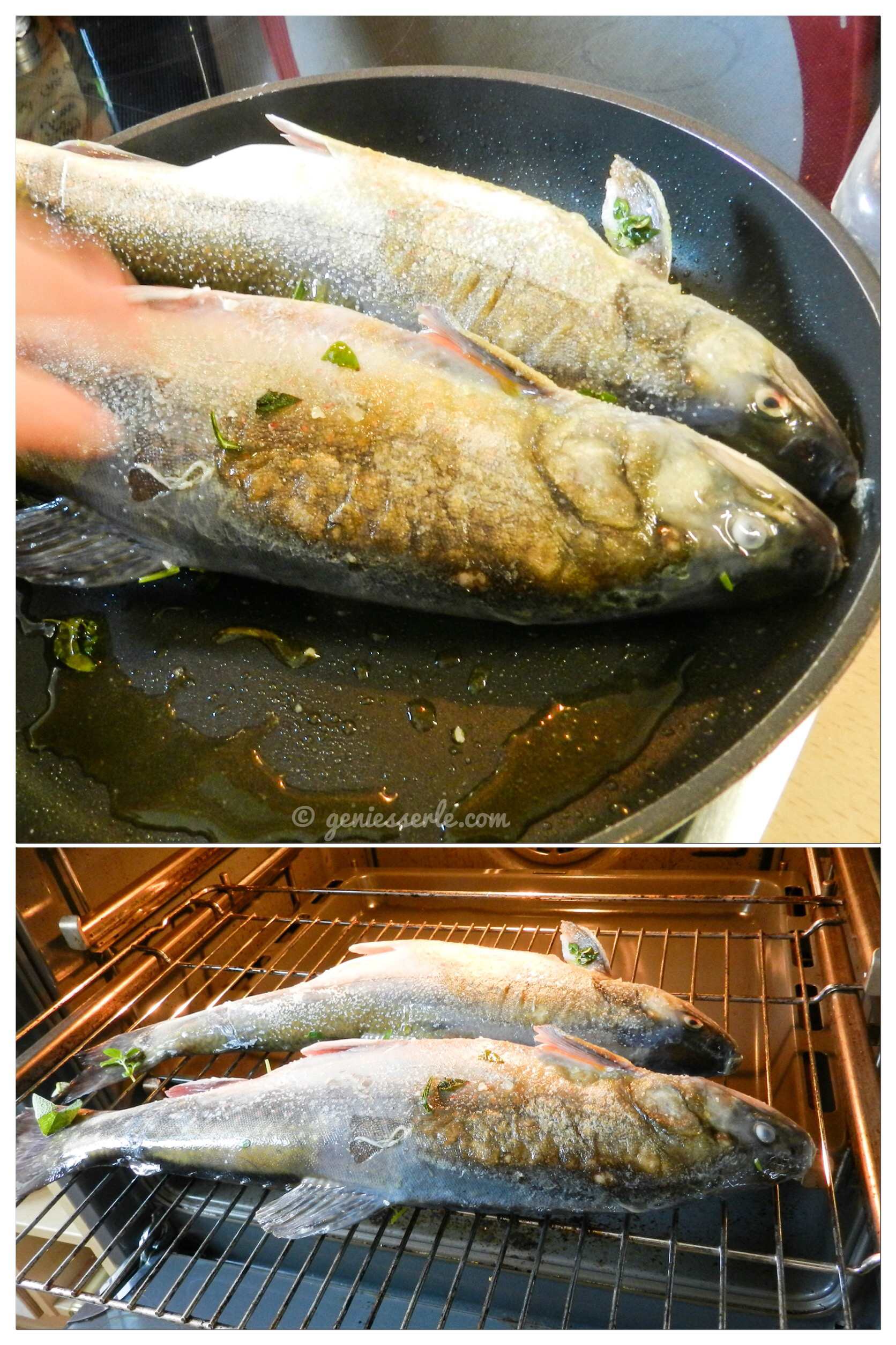 … dann auf das Backofengitter legen und – je nach Fischdicke – ca. 45 Minuten im Backofen vor sich hin garen lassen.