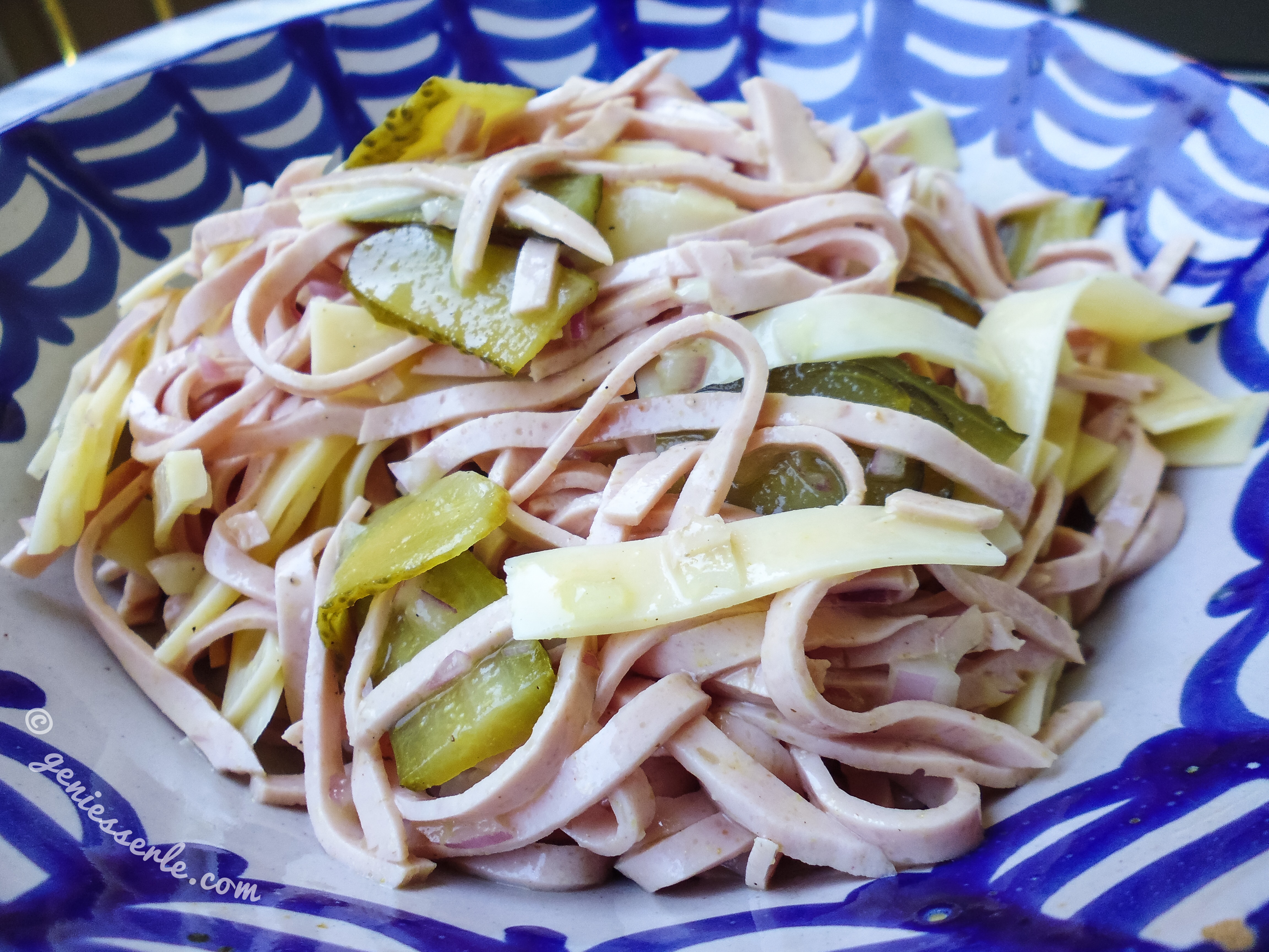 Hmmm, es geht doch eigentlich (fast) nichts über einen Schweizer Wurstsalat! Der bei den Schweizern übrigens als „Wurst-Käse-Salat“ bekannt ist 😊. Die deutsche Namensgebung kommt wohl vom Emmentalerkäse, der hier nicht fehlen darf.