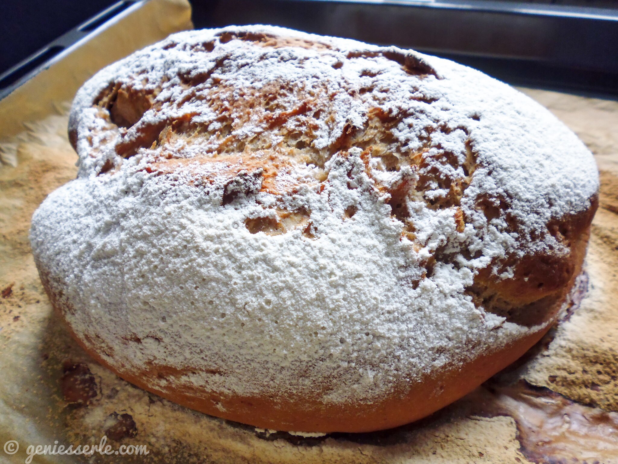 ( 5 ) Vor dem Backen wird der Brotlaib noch mit Wasser eingepinselt und mit etwas Mehl bestäubt. Nun wird er für 15 Minuten bei 250 C gebacken und dann weitere 15-20 Minuten mit 200 C.