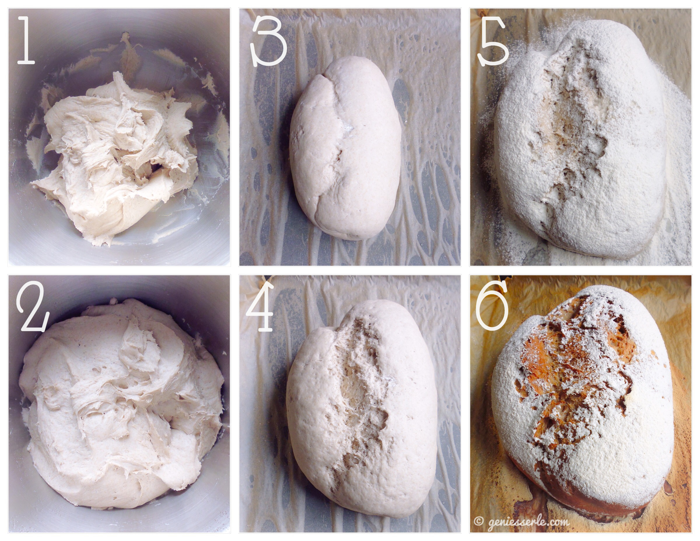 ( 3 ) Den aufgegangenen Teig nach der Teigruhe auf einer bemehlten Arbeitsfläche nochmals durchkneten und zu einem ovalen Brot formen. Den Brotlaib dann auf das vorbereitete Backblech legen, so dass die Faltstelle oben ist (da bricht es später dann so schön)