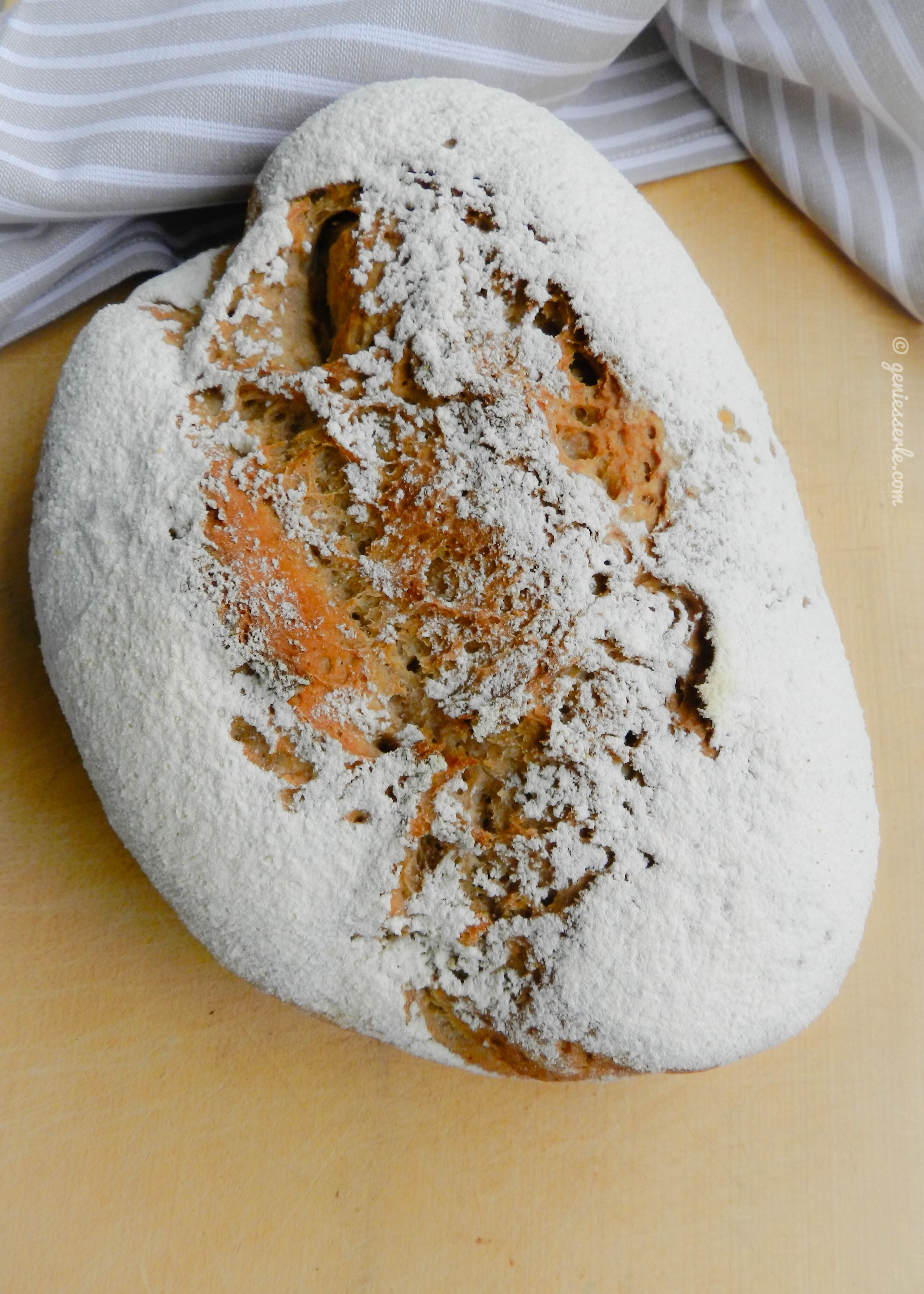 Dein Brot würde ich immer essen: zum Frühstück, als belegtes Brot zwischendurch und als Abendbrot. Mit seiner bemehlten Oberfläche sieht es wie früher aus der Backstube auf dem Land aus, ach, ich rieche es bis hierher, hmmm. Seinen Namen „Landbrot“ hast Du perfekt ausgewählt.