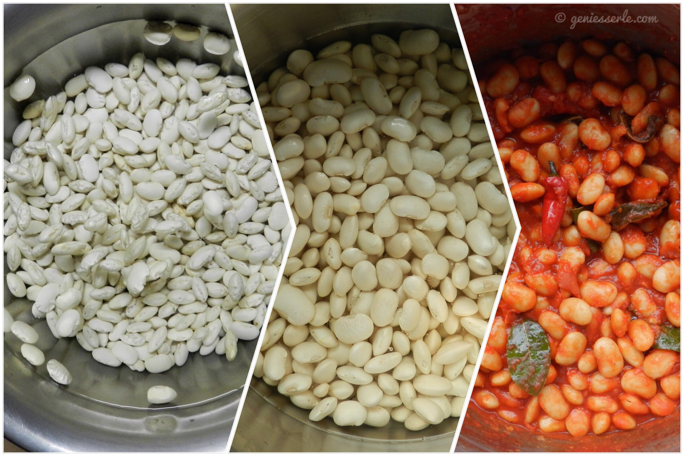 Wir verwenden immer getrocknete weisse Bohnen, die über Nacht eingeweicht werden, da diese geschmacklich einfach aromatischer sind. Wichtig ist übrigens, dass man ins Kochwasser KEIN Salz gibt, da sie sonst hart bleiben (fragt mich bitte nicht warum 😉, …) – Salz kommt erst dazu, sobald sie weichgekocht sind. Mit etwas Natron im Kochwasser werden sie übrigens ein bissle schneller weich 😊.