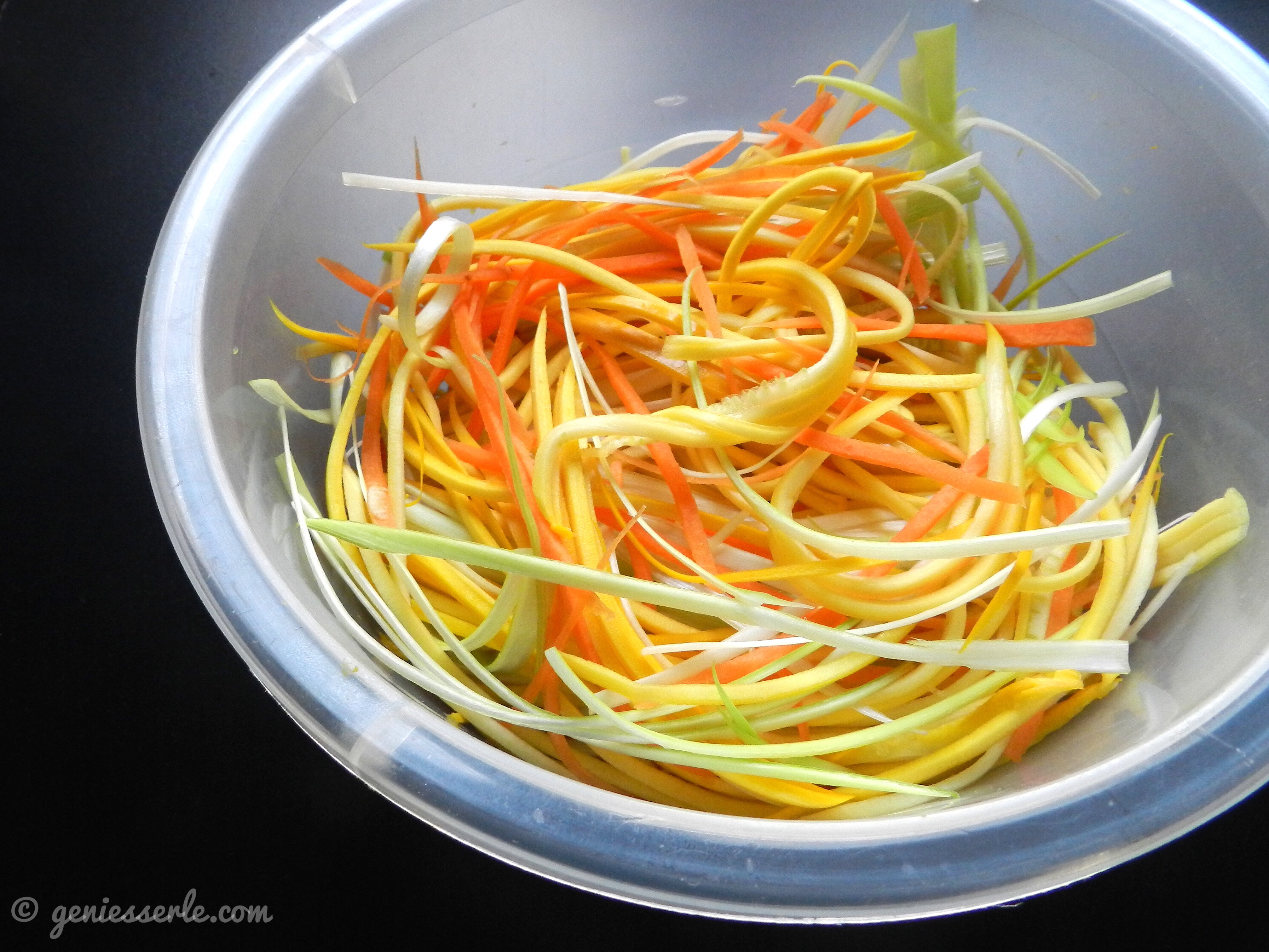 * für die dünn geschnittenen Streifen der Zucchini & Karotten habe ich wieder meinen Julienne Sparschäler (von Oxo) verwendet.