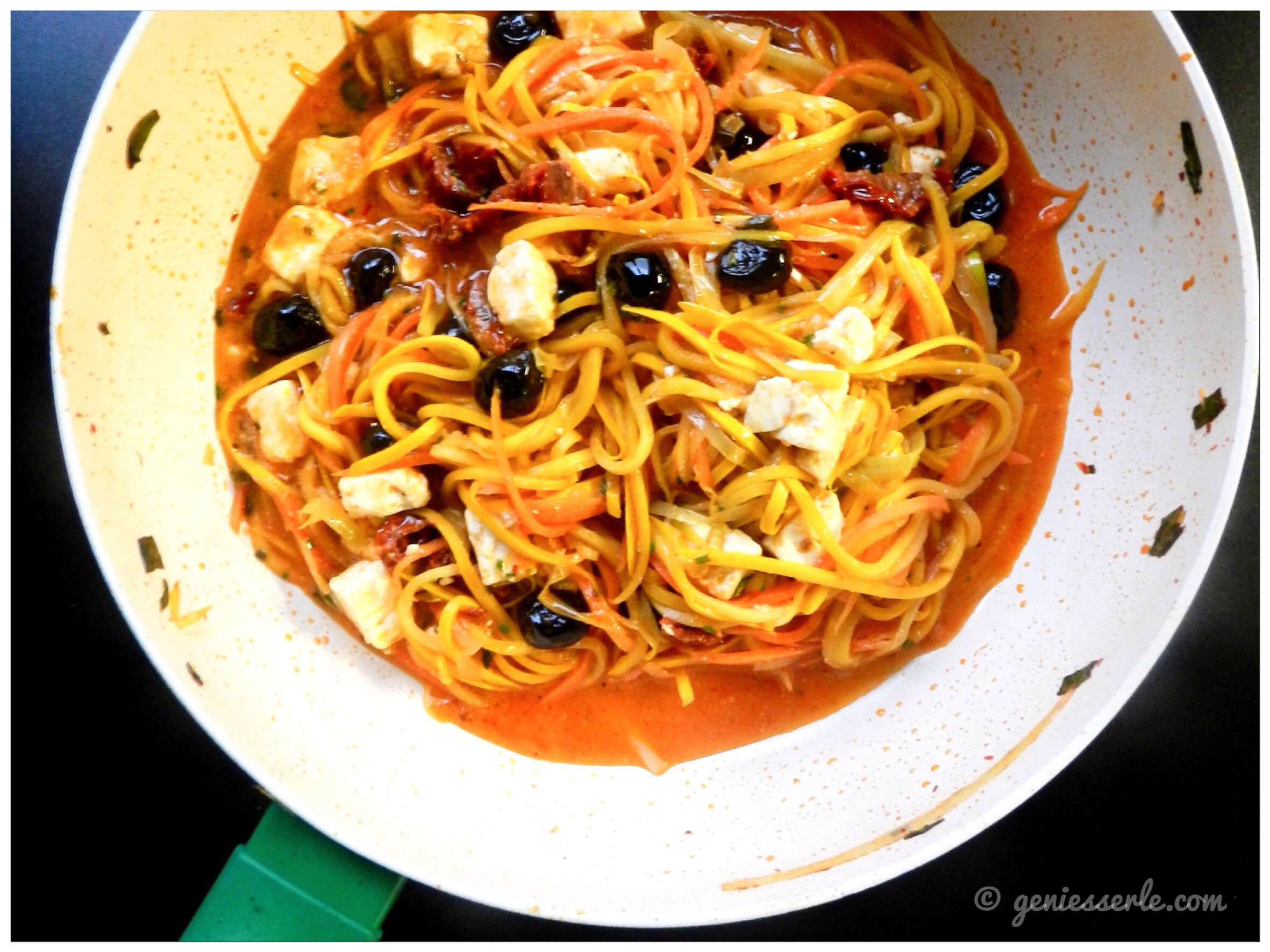 Gemüsenudeln mit Feta, Oliven & getrockneten Tomaten